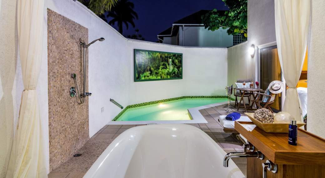 The hotel comprises of thirty suites arranged in a horseshoe shape around eight acres of lush tropical gardens facing out towards the sea. Each suite is beautifully decorated, boasting its own balcony or patio, relaxing whirlpool bath and exquisite views of the opulent surroundings.